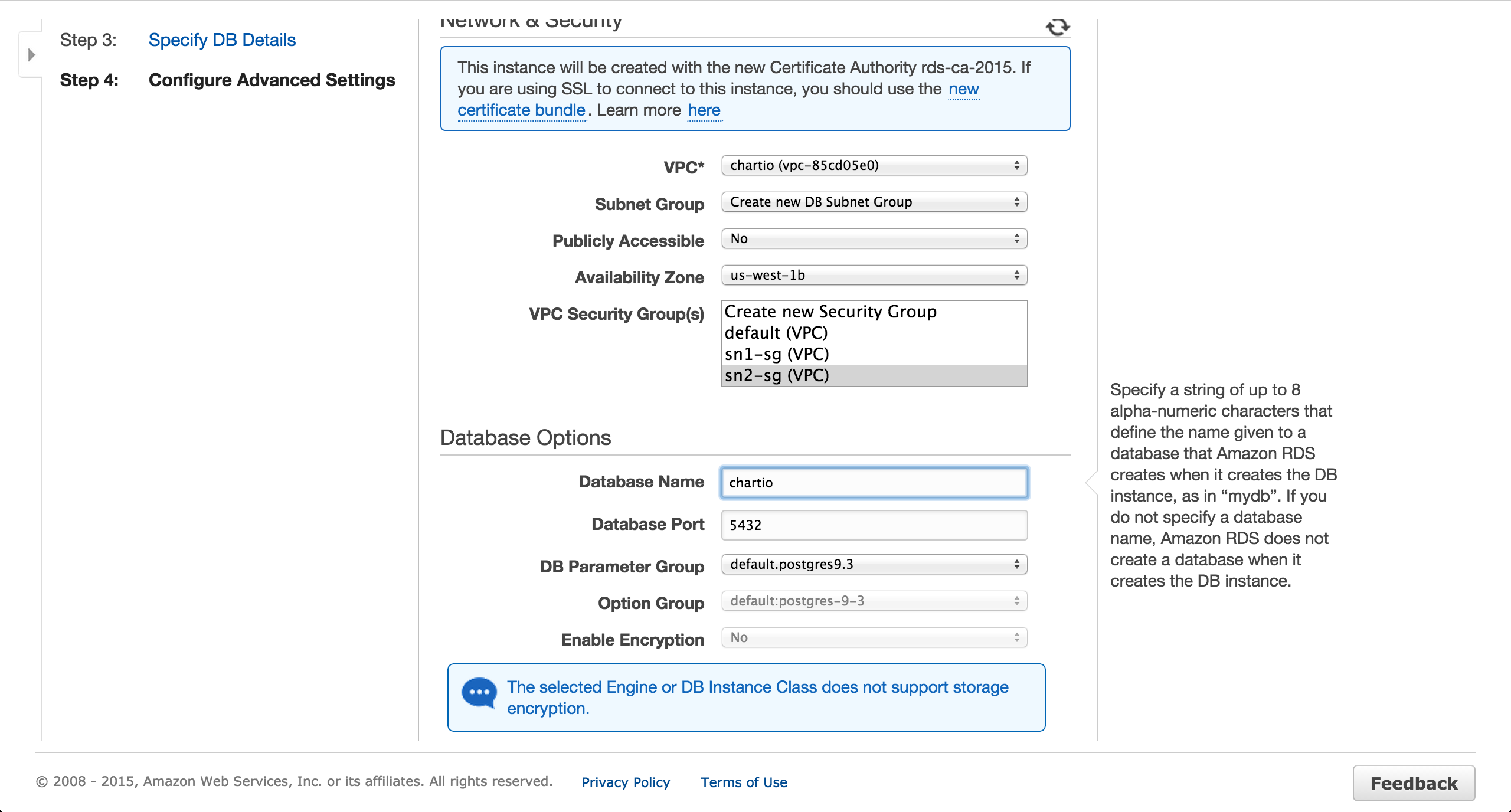# Substitute chartio.cacziwncd30i.us-west-1.rds.amazonaws.com with your instance's endpoint.